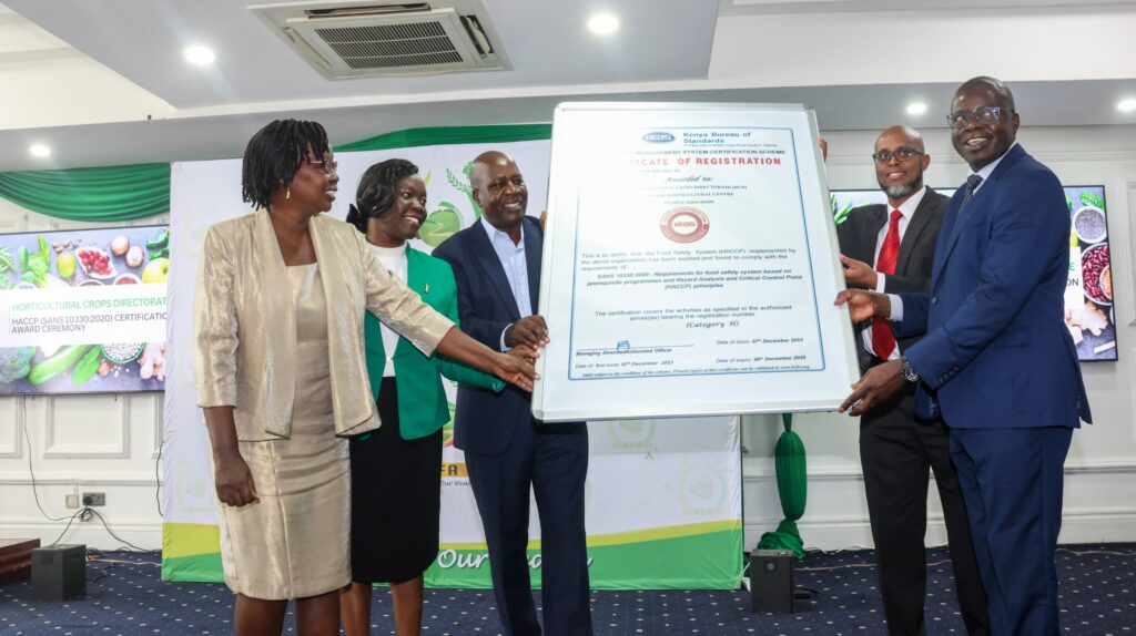 Agriculture and Food Authority on Wednesday received certification for its Nairobi pack house. The certification was a demonstration of AFAs commitment to providing lead and adhering to food quality and safety standards. The certification ceremony was presided over by Trade mark Africa country Director Mr. Farah on Wednesday. This certification was put in place to ensure that processes are controlled at very critical way so that hazards are prevented and measures put in place to provide biological and other hazard in the production system of the food products and services. Zachariah Lukorito KEBS said that certification will help to access market without any problem. Food safety has been a requirement many countries have been looking, hence Kenyan market for horticultural produce have not being meeting external market demands, this have been triggered by poor packaging. AFA Chairman Hon. Cornelly Serem said Kenyans have been exporting immature mangoes and avocadoes, mixing mangoes and avocados in same container. “There is huge demand for the horticulture as well as production system, but country’s standard looks unstandardized “said Serem.
